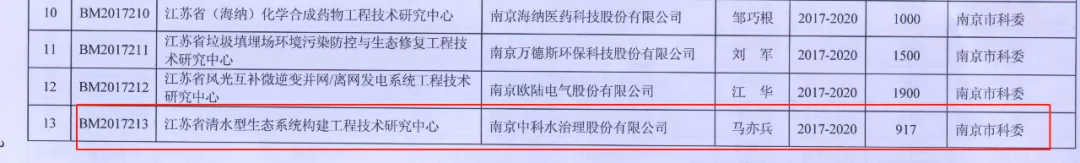 2017年11月,江蘇省科學(xué)技術(shù)廳將“江蘇省工程技術(shù)研究中心”建設(shè)項目下達給222家單位,南京中科水治理股份有限公司承擔(dān)“江蘇省清水型生態(tài)系統(tǒng)構(gòu)建工程技術(shù)研究中心”建設(shè)工作。