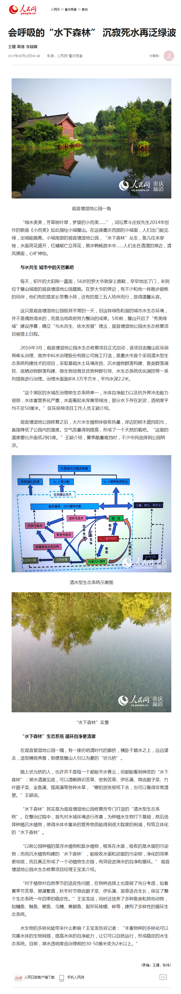 重慶日報、重慶之聲、重慶電視臺、重慶晚報、重慶晨報、重慶商報、華龍網(wǎng)、《當(dāng)代黨員》雜志社等市級主流媒體記者,來到觀音塘濕地公園,實地探訪了“水下森林”建設(shè)情況,采訪了項目設(shè)計施工單位【南京中科水治理股份有限公司】工作人員。觀音塘濕地公園項目是由中科水治理傾力打造的精品水生態(tài)修復(fù)項目,也是重慶市首個生態(tài)文明建設(shè)示范基地。