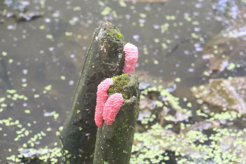 蕪雜的環(huán)境又滋生了大量的蚊蟲和具有血吸蟲病傳染危害的釘螺,水體散發(fā)出陣陣難聞的異味,讓人敬而遠之。如果稍稍觀察水岸邊,還會發(fā)現(xiàn)石塊和植物枝葉上有一團團紅色的異物,那是福壽螺產(chǎn)的卵,一種對環(huán)境產(chǎn)生很大破壞的入侵物種,它們不僅貪婪啃食周圍各種植物,還會因攜帶寄生蟲(如廣州管圓病蟲等)而傳播疾病,導致這一區(qū)域的水體生態(tài)環(huán)境進一步失衡,淪為一片死氣沉沉的臭水塘,嚴重影響了黑龍灘區(qū)域整體的水生態(tài)健康。