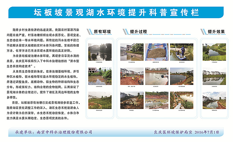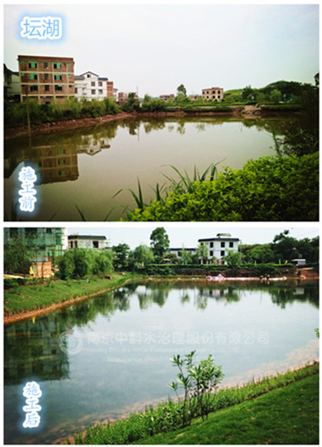 2015年12月12日,中科水治理參與的壇板坡景觀湖水生態(tài)構(gòu)建工程正式開工,景觀湖位于中心街區(qū)的東部,分為壇湖和板湖兩個獨立的水體,是典型的農(nóng)村污染型水體。水體總面積約15畝,平均水深1.5米,采用中科水治理獨創(chuàng)的“清水型生態(tài)系統(tǒng)構(gòu)建技術(shù)”,主要建設(shè)內(nèi)容包括基底改良、湖形重塑、微生物菌種投放、沉水植物群落構(gòu)建、挺水、浮葉植物群落構(gòu)建、魚類放養(yǎng)、大型底棲動物投放等。2016年3月30日,項目順利通過驗收。